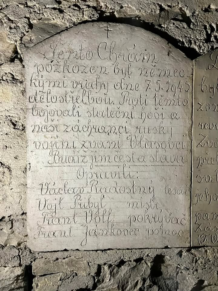 📛 Nehořlavý doklad revolučních dní Pražského povstání v krovu hostivického kostela. A hned vedle záznam o obnově a vysvěcení hlavního zvonu.