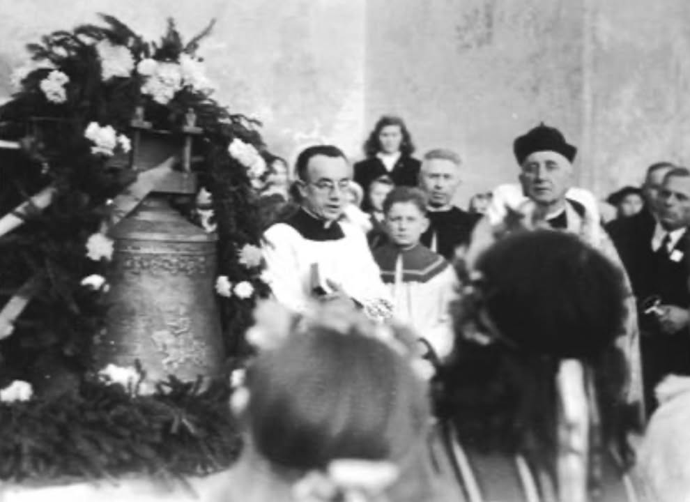 📸 Ještě jedna černobílá dobová fotografie. Tentokrát ze svěcení nově ulitého sv. Václava. Jak je napsáno na omítkové desce v krovu kostela, svěcení a zavěšení zvonu na věž ...