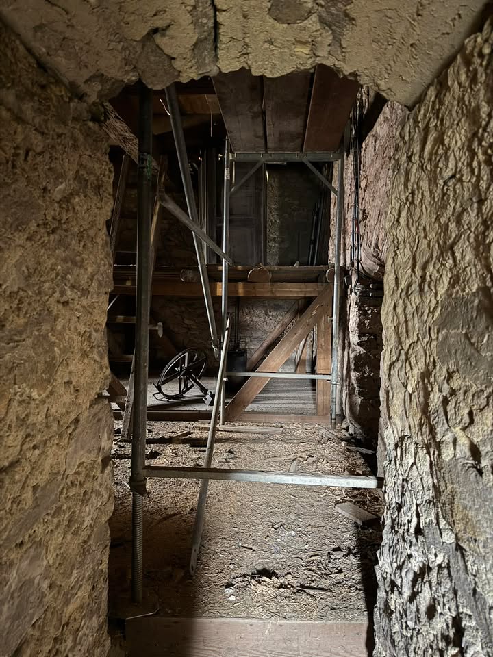 🪚🪜 Práce na úpravách zvonové stolice se rozjely naplno. Konečně jsme totiž získali povolení stavby, které je pro památky nově povinné i při údržbě.