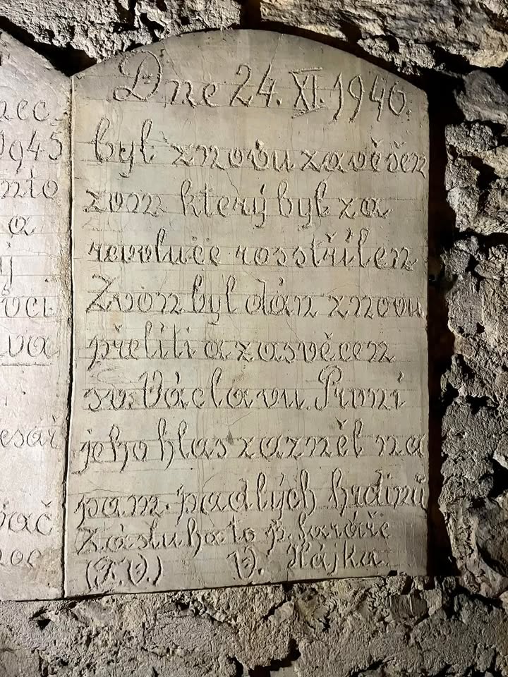 📛 Nehořlavý doklad revolučních dní Pražského povstání v krovu hostivického kostela. A hned vedle záznam o obnově a vysvěcení hlavního zvonu.