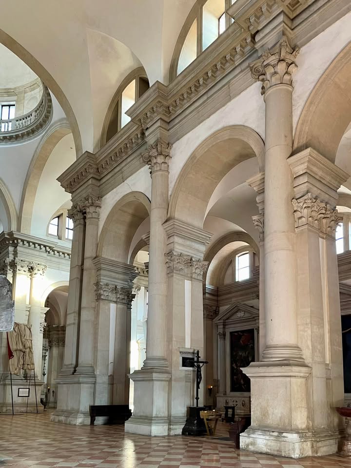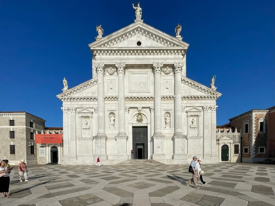 🛐 Kostel San Giorgio Maggiore stojí přímo proti otevřené straně náměstí sv. Marka a je to první ze dvou kostelů, které v Benátkách postavil nejvýznamější architekt pozdní renesance Andrea Palladio. Když se pozorně podíváte na fasádu, je složena ze dvou chrámových průčelí položených na sebe 😲
