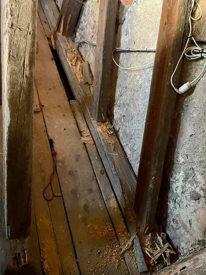 👉 Nechali jsme u pana Potužáka vypracovat diagnostický průzkum zvonové stolice, který odhalil úplný rozpad nosného trámu a částečně i sloupku a vzpěr konstrukce, která byla do zvonové stolice přidána při poslední obnově zvonů roku 1924. Na rozdíl od zbytku stolice z roku 1802 je z měkkého dřeva a dřevokaznému hmyzu zjevně chutnala 🪳🦟🐛