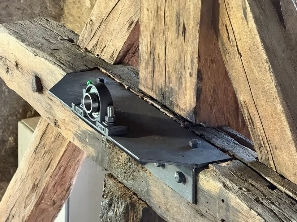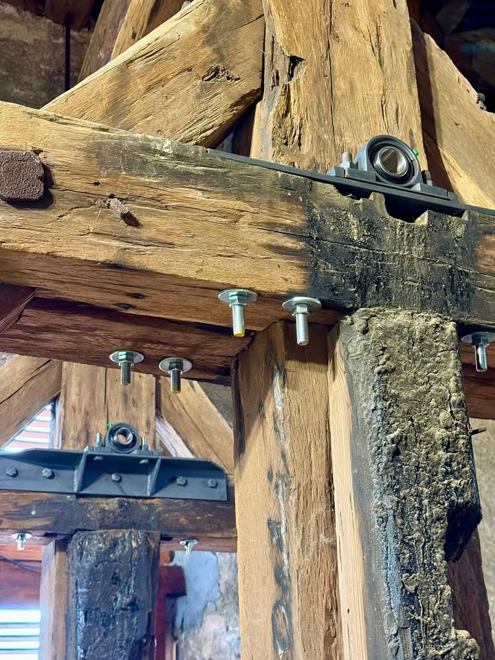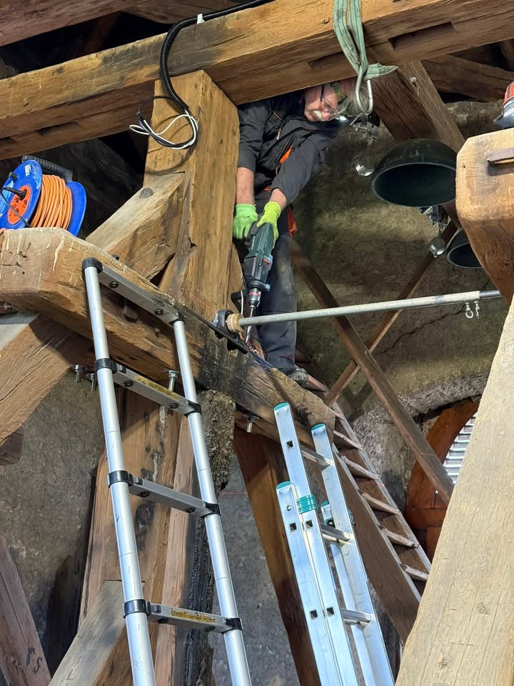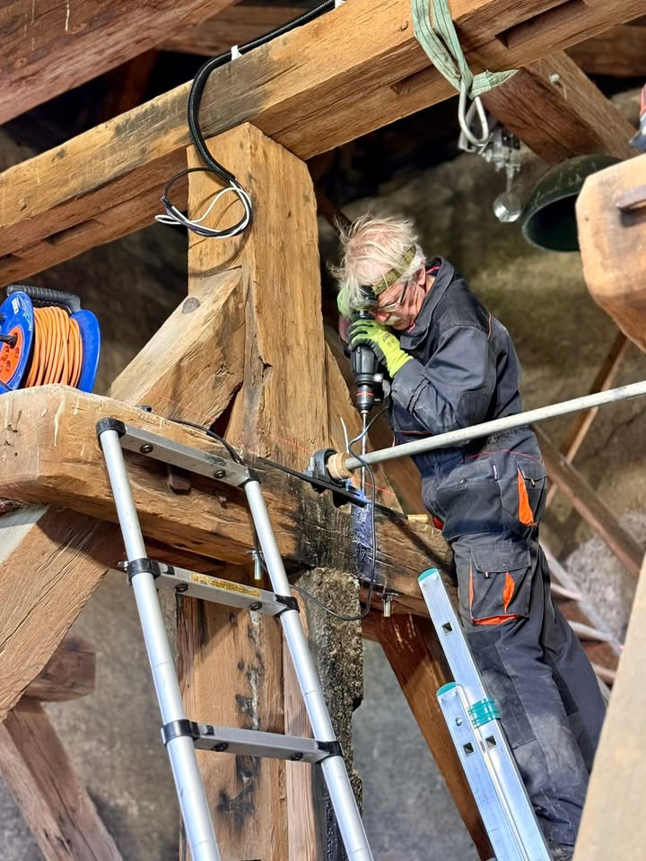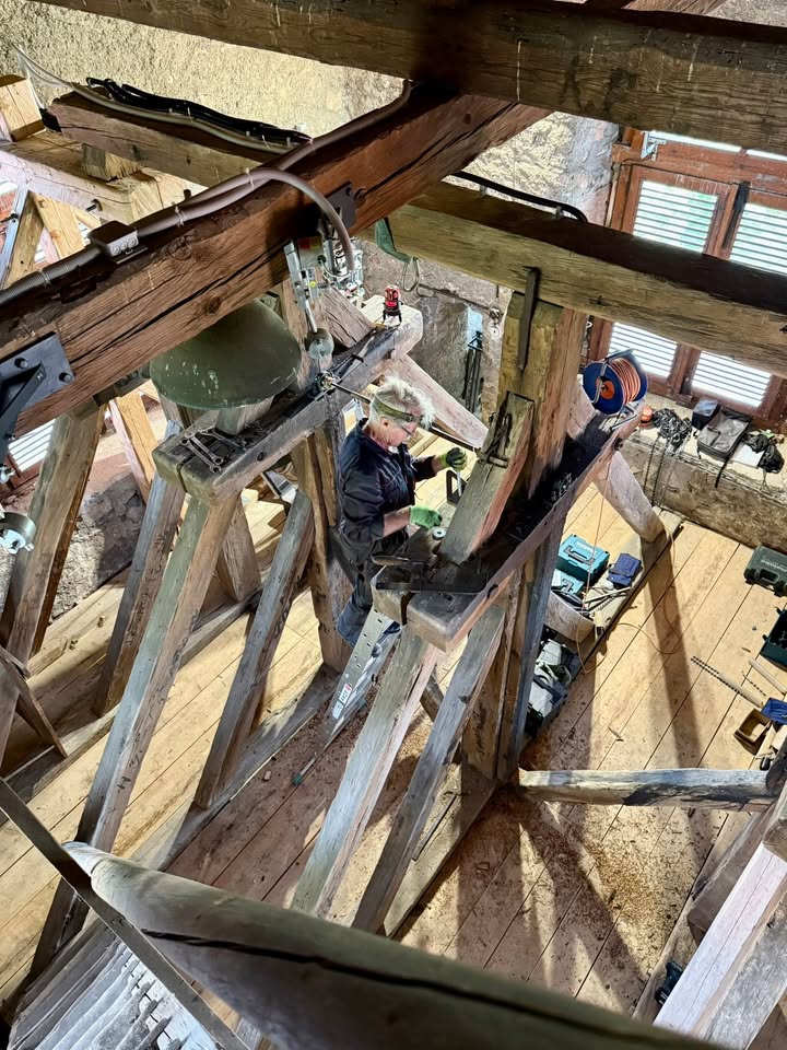 🔔🔔 Ve věži bylo včera rušno. Pan Manoušek upevnil na zvonovou stolici desky s ložisky, ve kterých se budou zvony houpat.